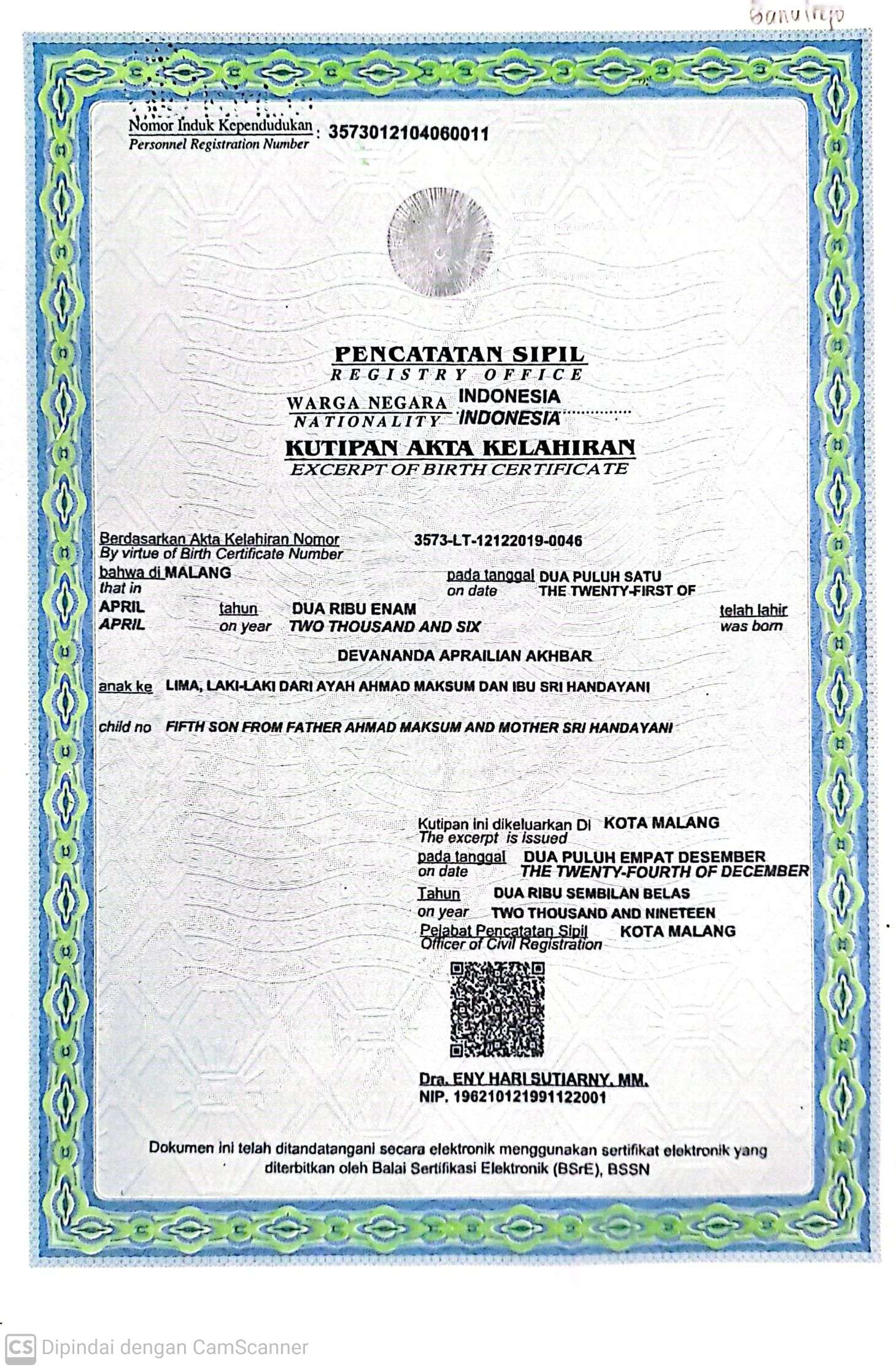 Akta Kelahiran :