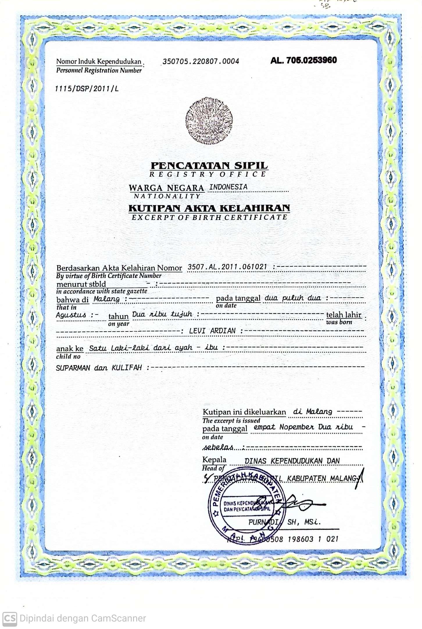 Akta Kelahiran :